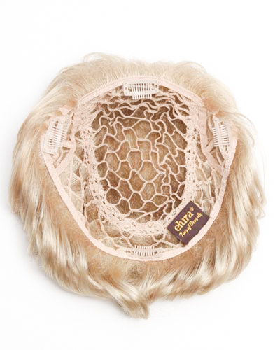 Snap-on toupee clip honeycomb hairpiece with 4 clips. The honeycomb base allows you to blend your own hair into it. 5.5″ overall length of wavy curls.
